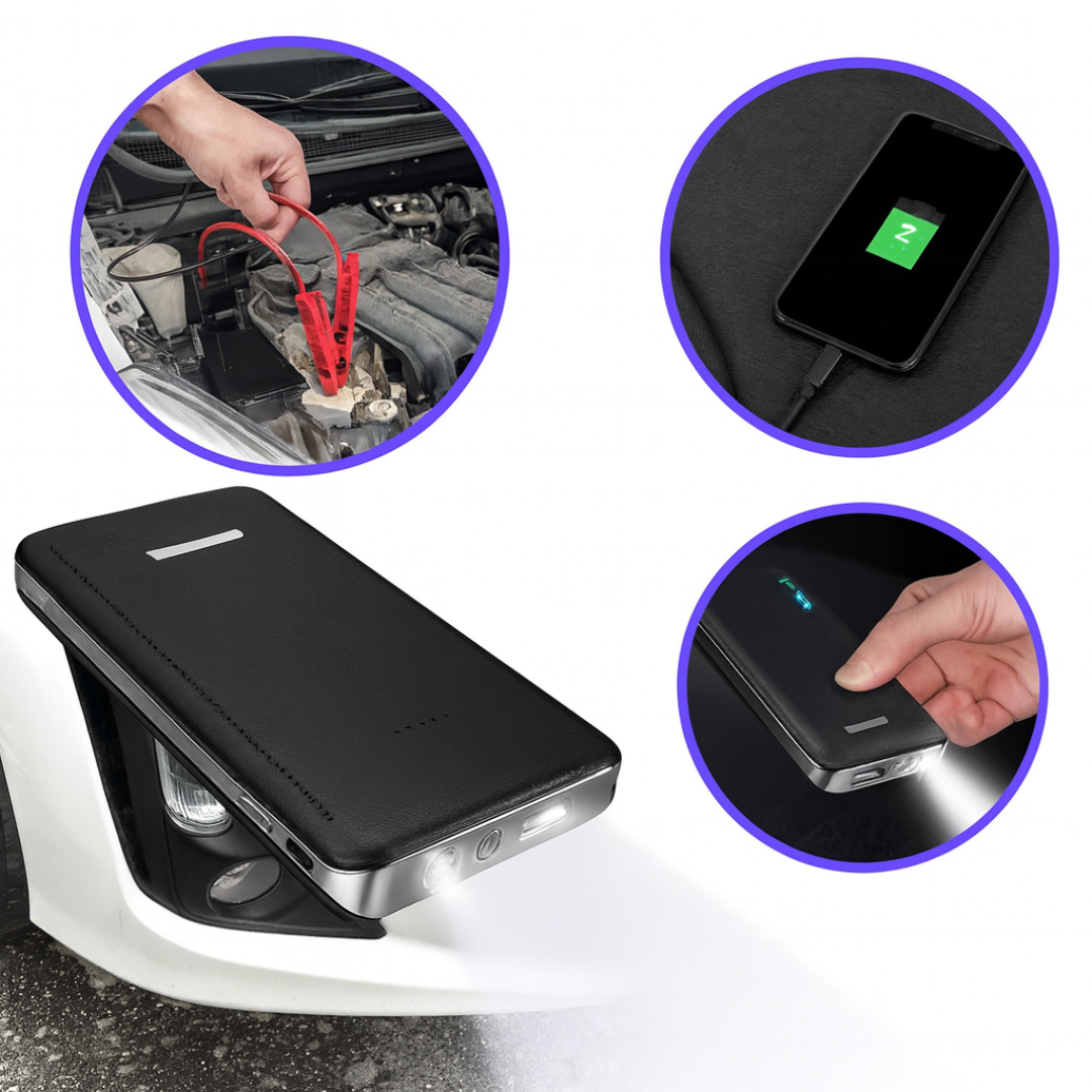 No te quedes más tirado por la batería. Arrancá tu auto en 2–3 segundos, cargá tu celular, usalo como linterna y power bank. Ideal para autos, motos y camionetas.